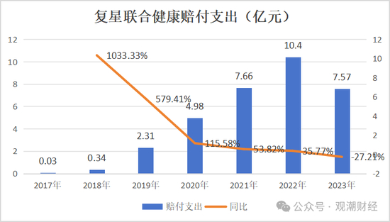 2023年,复星联合健康实现7.27亿元的赔付支出,较2022年同比下降27.21%,这是自其成立以来赔付支出首次下降。实际上,2017-2022年,该公司赔付支出逐年递增,但赔付支出增速逐年递减。