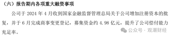 并且,公司2024年4月收到国家金融监管总局关于公司增加注册资本的批复,募集资金约4.98亿元,提升了公司偿付能力充足率。