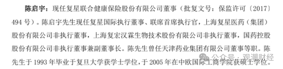 在复星联合健康成立之初,陈启宇便出任该公司董事长,随后在2023年8月辞去复星联合董事长职务,由时任公司总经理的曾明光接任。