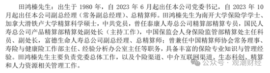 2023年4月,陈国平在微信朋友圈透露其离职的信息,接任总经理职务的是曾在泰康人寿、富德生命人寿和国民人寿等公司工作过的田鸿榛。