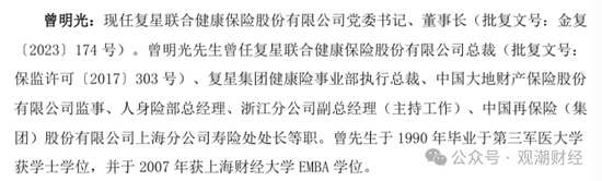 公开资料显示,在复星联合健康成立之初,曾明光便出任该公司总裁。在加入复星前,曾明光曾任中国大地财产保险股份有限公司监事、人身险部总经理、浙江分公司副总经理(主持工作)、中国再保险(集团)股份有限公司上海分公司寿险处处长等职。