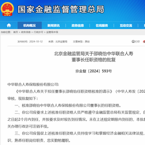 中华联合人寿方面,10月12日,邵晓怡中华联合人寿董事长任职资格获批,其前任为孙玉淳。资料显示,邵晓怡出身财务条线,在到任中华联合人寿董事长之前是中华保险集团副总裁、财务负责人。