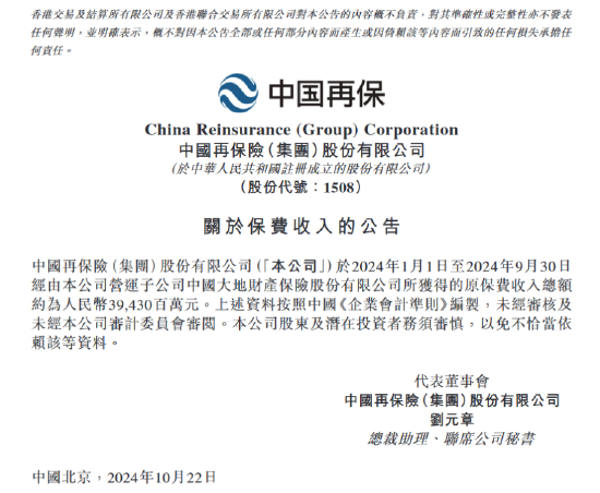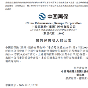 10月22日金融一线消息,中国再保险今日发布关于保费收入的公告。公告显示,公司于2024年1月1日至2024年9月30日经由公司营运子公司中国大地财产保险股份有限公司所获得的原保费收入总额约为人民币394.30亿元,较上年同期389.46亿元增长1.2%。