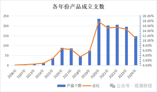 根据基金成立时间的趋势分析,2020年保险资管产品的设立数量显著增长,并在当年达到顶峰。截至2024年10月20日,年内已新成立148支保险资管基金,占当前存续基金总量的11.05%。其中,2020年设立的基金产品在存续基金中占比达到17.63%,为历年最高。