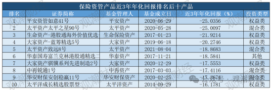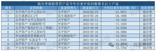 今年以来年化回报排名后十的混合类保险资管产品中,太平资产管理的产品占据多数,包括排名第一的太平之星23号,其年化回报为-21.8%,表现最差。后五名中,除了太平资产的产品,还包括民生通惠资管管理的信乙2号和中意资产的卓越铺绿7号,回报率分别为-20.2%、-17.18%。整体来看,太平资产旗下的混合类产品表现相对不佳,多个产品回报率均在-15%至-22%之间。