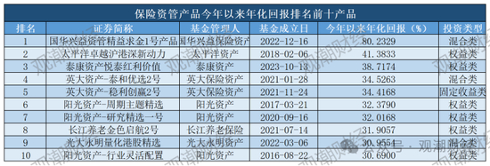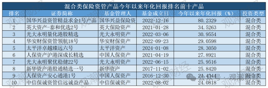 在混合类保险资管产品中,今年以来年化回报排名前五的产品分别为国华兴益资管的精益求金1号、英大资产的泰和优选2号、光大永明资产的量化港股精选、华安财保资管的领航18号以及太平洋资产的卓越臻远六号,年化回报率分别为80.23%、34.53%、30.96%、29.06%、28.31%。值得关注的是,光大永明资产的另一产品——聚优稳健22号,也跻身前十名,位列第七,年化回报率为25.95%。