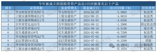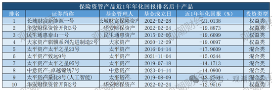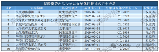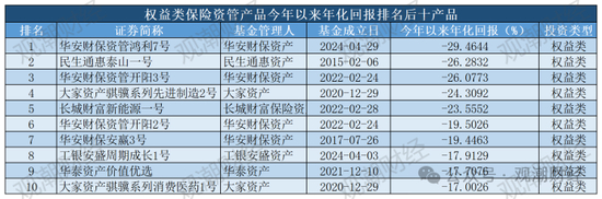 今年以来年化回报排名后十的权益类保险资管产品中,华安财保资管的鸿利7号以-29.46%的年化回报排名倒数第一,表现最差。民生通惠资管的泰山1号和华安财保资管的百财3号分别以-26.28%和-26.08%的回报率位列第二和第三。这些表现较差的产品大多为传统权益型产品,且回报率在-29%至-17%区间内,在今年的市场动荡中,这些产品未能有效规避风险,策略上可能未能灵活应对市场变化。