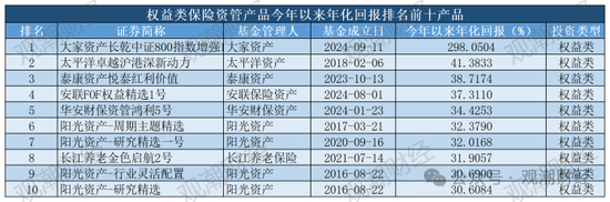 今年以来年化回报排名前十的权益类保险资管产品表现十分优异,其中,大家资产管理的长乾中证800指数增强1号以高达298.05%的年化回报率占据榜首,值得注意的是,该产品于今年九月新成立,而该产品的成立以来回报为16.34%,因此计算年化回报率表现尤为突出。