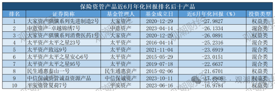 在近6月年化收益率排名后十的产品中,太平资产仍占据四席,分别为太平之星23号、致远9号、太平之星95号以及量化8号(人工智能)。这些产品的近一年回报率分别为-17.96%、-15.02%、-14.17%和-13.28%,均为偏股混合类产品。
