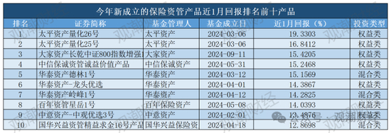 在今年内新成立的148支保险资管产品中,近1月回报率排名前三的产品分别来自太平资产的量化26号和量化25号,以及大家资产的长乾中证800指数增强1号,回报率分别为19.33%、16.84%、15.42%。