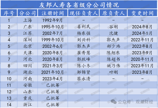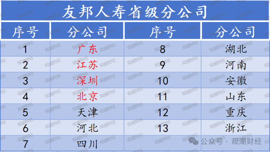 在友邦人寿“分改子”前,友邦上海(友邦中国在上分基础上组建,组建后仍能在上海展业,但无上海分公司)、广东、江苏、深圳、北京5家分公司便已成立。即友邦人寿“分改子”至今已陆续成立天津、河北、四川、湖北、河南、安徽、山东、重庆、浙江9家分公司,数量已远超“分改子”前。