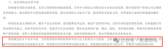 今年9月,国务院印发的《关于加强监管防范风险推动保险业高质量发展的若干意见》中提出,持续推进高水平对外开放,支持优质境外保险机构来华设立法人机构及分支机构,支持合格境外机构投资入股境内保险机构。