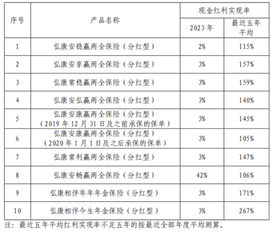 此外,曾经仰仗分红险“打天下”的弘康人寿如今风光不在。根据其2023年度分红型保险产品红利实现率的信息披露,弘康人寿多个产品的分红实现率下滑严重,最低跌至仅为2%。