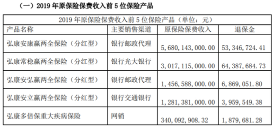 分红险曾是弘康人寿的拳头产品,在2019年,该公司原保费收入排名前四的产品均为分红型保险,累计贡献了超过110亿元的原保费收入。然而,2020年2月,原银保监会发布《关于强化人身保险精算监管有关事项的通知》,该通知明确了演示利率上限,并将红利分配比例统一为70%。或许受此政策影响,弘康人寿分红险原保费收入迅速下降,2020年、2021年排名前五的分红险仅有3项目,累计贡献仅为46.93亿元、18.12亿元。2022年以后,原保费收入前5的产品中甚至已经没有分红险的身影,取而代之由终身寿险产品成为其主要收入来源。