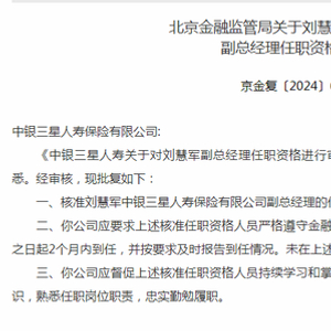 近日,国家金融监督管理总局发布的批复信息显示,中银三星人寿保险有限公司(下称:中银三星人寿)副总经理刘慧军的任职资格获批。