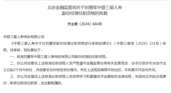 11月22日,国家金融监督管理总局北京金融监管局发布的批复公告,核准刘慧军中银三星人寿保险有限公司副总经理的任职资格。