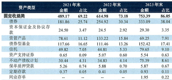 先来看固定收益类资产,该分部是由银行协议存款、债券、债券型基金、固收类资管产品、信托及债权计划等组成。截至2023年末,利安人寿固定收益类资产投资规模为753.39亿元,较上年末增长22.51%;在投资资产中的占比为86.05%,较上年末提升12.87个百分点。