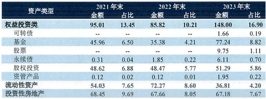 紧随其后的则分别是信托、不动产债权计划和资管产品。其中,主要面向百瑞信托、华鑫信托、山东信托、国投泰康信托等发行方提供的信托计划投资金额达79.65亿元,占比9.1%;主要投向基础设施和不动产项目的不动产债权计划投资金额为75.39亿元,占比8.61%;公司资管产品投资金额为69.25亿元,占投资资产总额的7.91%,底层资产以货币型基金、银行协议存款等为主。