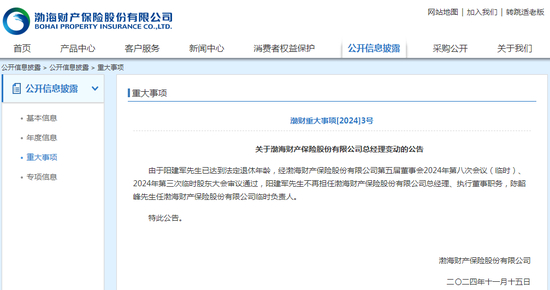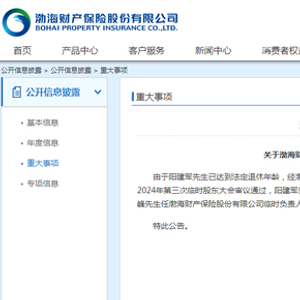 近日,渤海财产保险股份有限公司(简称“渤海财险”)发布公告称,由于阳建军已达到法定退休年龄,经公司第五届董事会2024年第八次会议(临时)、2024年第三次临时股东大会审议通过,阳建军不再担任渤海财产保险股份有限公司总经理、执行董事职务,陈韶峰任渤海财产保险股份有限公司临时负责人。