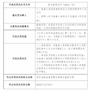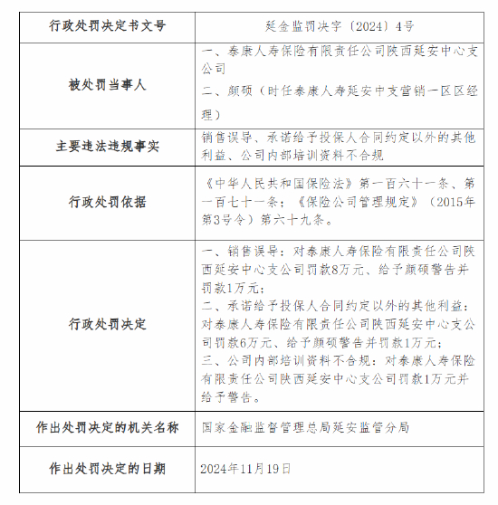 12月2日金融一线消息,国家金融监督管理总局延安监管分局行政处罚信息公开表显示,泰康人寿保险有限责任公司陕西延安中心支公司因销售误导、承诺给予投保人合同约定以外的其他利益、公司内部培训资料不合规,被罚款合计15万元。国家金融监督管理总局延安监管分局的行政处罚决定如下: