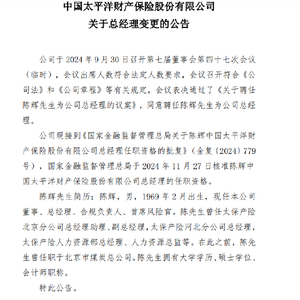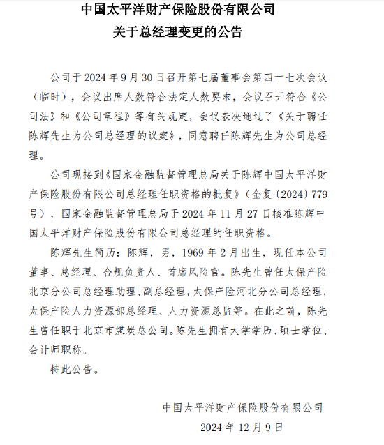 12月10日金融一线消息,中国太平洋财产保险股份有限公司(以下简称“太保产险”)近日公告表示,公司于2024年9月30日召开第七届董事会第四十七次会议(临时),表决通过了《关于聘任陈辉先生为公司总经理的议案》,同意聘任陈辉先生为公司总经理。现接到《国家金融监督管理总局关于陈辉中国太平洋财产保险股份有限公司总经理任职资格的批复》(金复(2024)779号),国家金融监督管理总局于2024年11月27日核准陈辉中国太平洋财产保险股份有限公司总经理的任职资格。
