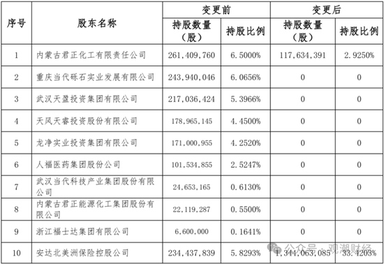 同日,内蒙古君正化工、重庆当代砾石实业发展、武汉天盈投资集团、天风天睿投资、龙净实业投资集团、人福医药集团、武汉当代科技产业集团、内蒙古君正能源化工集团、浙江福士达集团9家股东同时“清仓”股权。