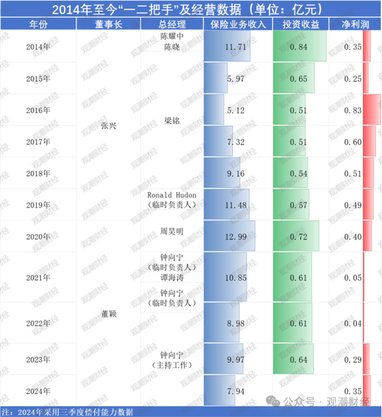 相较于董事长,该险企总经理职位更替频繁,多位总经理皆为“快闪”上下任。据观潮财经统计,2014年至今的10年间,史带财险共更换5位总经理,2位临时负责人以及一任副总经理主持工作。