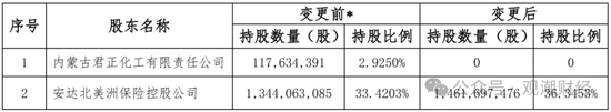 2023年,“安达系”继续发力,收购内蒙古君正化工最后持有的2.925%股份。当年12月,该笔股权转让获国家金融监管总局核准,安达北美洲保险持股比例再次增至36.35%。