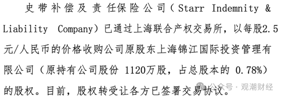 此次股权转让最早可追溯至今年8月,上海锦江国际投资管理在上海联交所以2800万元的底价出清所持史带财险股份1120万股(占总股本0.78%)。