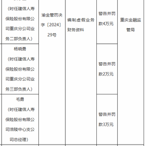 毛勇(时任建信人寿保险股份有限公司涪陵中心支公司总经理)因编制虚假业务财务资料,被警告并罚款3万元。