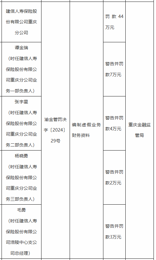 建信人寿重庆分公司被罚44万元:因编制虚假业务财务资料