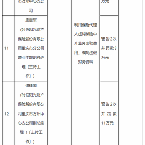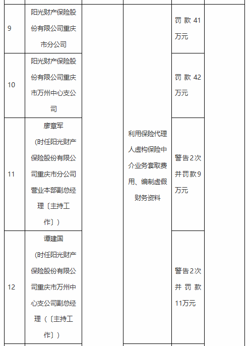 廖章军(时任阳光财产保险股份有限公司重庆市分公司营业本部副总经理〔主持工作〕)因利用保险代理人虚构保险中介业务套取费用、编制虚假财务资料,被警告2次并罚款9万元。