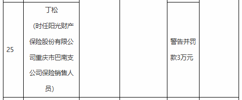 丁松(时任阳光财产保险股份有限公司重庆市巴南支公司保险销售人员)因利用保险代理人虚构保险中介业务套取费用,被警告并罚款3万元。