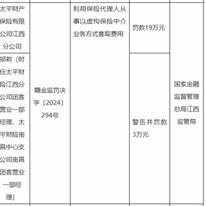 太平财险江西分公司被罚19万元:因利用保险代理人从事以虚构保险中介业务方式套取费用