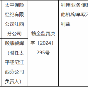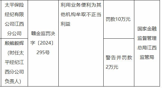 太平保险经纪江西分公司被罚10万元:因利用业务便利为其他机构牟取不正当利益