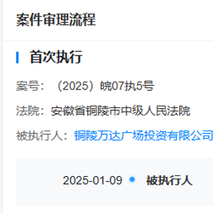 铜陵万达广场投资有限公司注册成立于2015年8月27日,注册资本3.82亿元,公司经营范围为房屋租赁。目前该公司为被执行人,执行法院为安徽省铜陵市中级人民法院,立案日期为2025年1月9日,执行标的约为20.89万元。