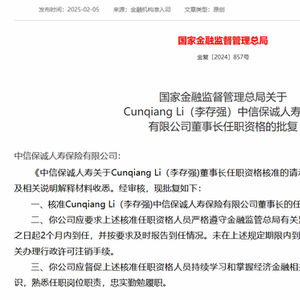 2月5日,国家金融监督管理总局发布了关于CunqiangLi(李存强)中信保诚人寿保险有限公司董事长任职资格的批复。