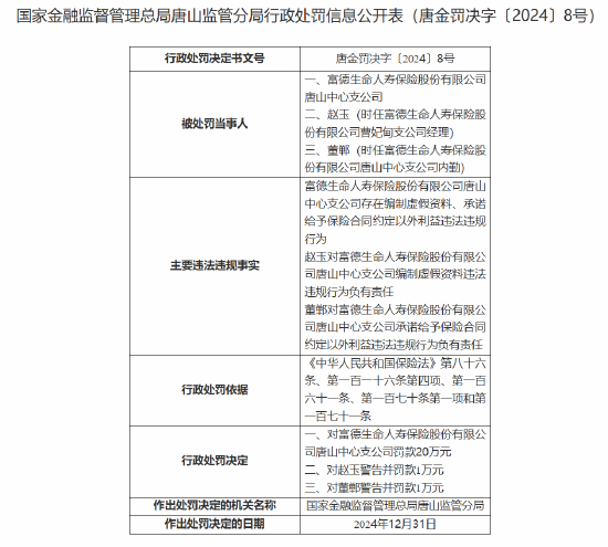 富德生命人寿唐山中心支公司被罚20万元:因编制虚假资料 承诺给予保险合同约定以外利益