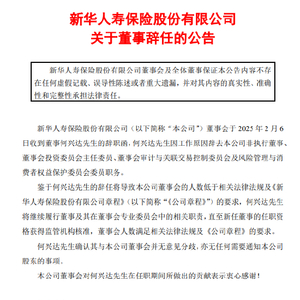 2月6日金融一线消息,新华保险发布公告称,董事会于2025年2月6日收到董事何兴达先生的辞职函。何兴达先生因工作原因辞去公司非执行董事、董事会投资委员会主任委员、董事会审计与关联交易控制委员会及风险管理与消费者权益保护委员会委员职务。