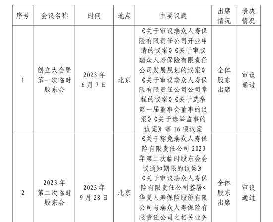 在股东情况、董监高人事信息透明的同时,瑞众人寿历次股东会的主要议题和表决情况也随之公布,据统计,瑞众人寿成立以来,开了11次股东会,通过了47项决议。涵盖高管选举、受让华夏人寿资产、制定发展规划及公司章程等议案。
