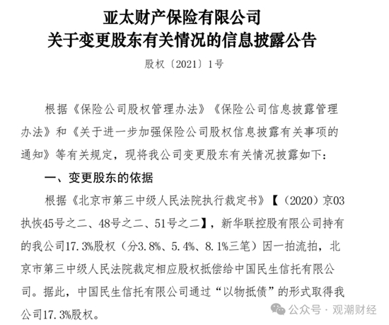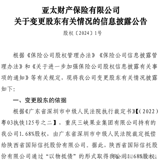 2024年3月,亚太财险再发公告称,该公司股东重庆三峡果业集团持有的1.68%股权由广东省深圳市中级人民法院裁定,抵偿给陕西省国际信托。
