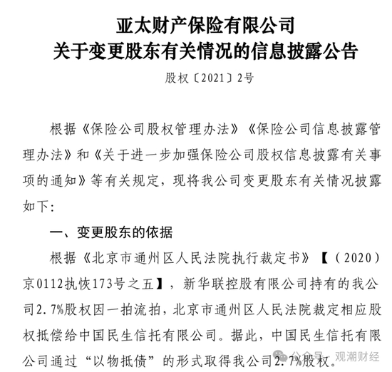 同年10月,亚太财险再次发布公告称,因一拍流拍,新华联集团所持亚太财险2.7%股权被裁定抵偿给民生信托,至此,新华联集团退出亚太财险。