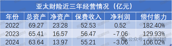 从财务数据上看,亚太财险近三年总资产、净资产、偿付能力不断下滑,2024年三季度风险评级为B类(中等风险),保费收入略有波动,连续两年亏损。