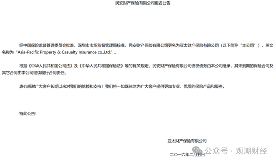 2015年11月,泛海控股联合新华联、亿利资源集团、重庆三峡果业集团以41亿元收购民安财险100%股权。泛海控股通过旗下武汉中央商务区股份有限公司持股51%,成为控股股东。2016年1月,公司正式更名为亚太财产保险有限公司,原有“民安”品牌被弃用。