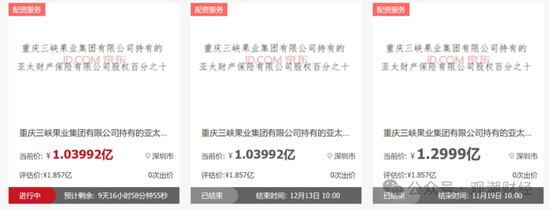 观潮财经关注到,这并非亚太财险首次股权被拍卖,2024年11月和12月,重庆三峡果业集团有限公司持有亚太财险10%的股权在京东司法拍卖平台上拍卖,历经两次流拍,目前这笔股权仍在继续拍卖,将于3月12日结束。