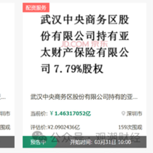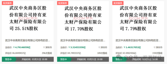 在刚刚过去的2月28日,京东司法拍卖平台发布三条股权拍卖信息:亚太财险最大控股股东武汉中央商务区所持有的51%股权被拆分为25.51%、17.70%、7.79%三笔,将于3月底在该平台公开拍卖,作价9.56亿元。