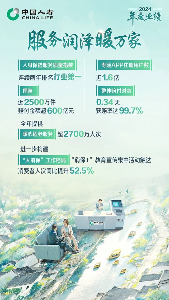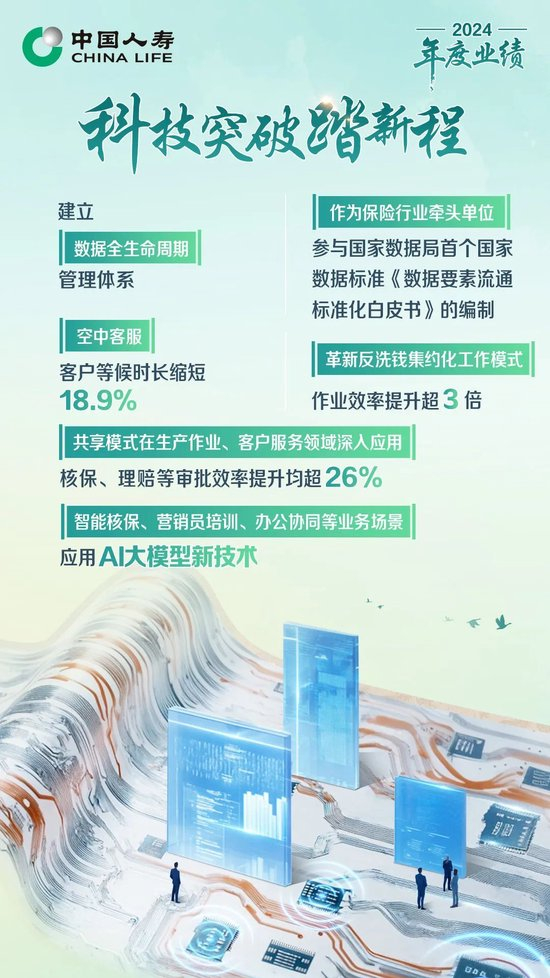 数智基建赋能升级。坚持科技全面自主掌控,加快推进数据中心向智能化、极简化、分布式架构转型,打造更加弹性、安全、可靠的数智新基建,有效支撑公司业务快速发展与前沿技术快速落地,在智能核保、营销员培训、办公协同等各类业务场景应用AI大模型新技术;以拥有近1.6亿注册用户的中国人寿寿险APP为核心,打造实时直达客户的数字化运营服务矩阵;全年服务超30亿人次,理赔近2500万件,核保、保全智能审核率分别达95.2%、99%;理赔时效保持行业领先地位,在27个省份推广“全流程无人工理赔”服务,“理赔预付”惠及客户数同比翻倍,“理赔直付”最快可至秒级。