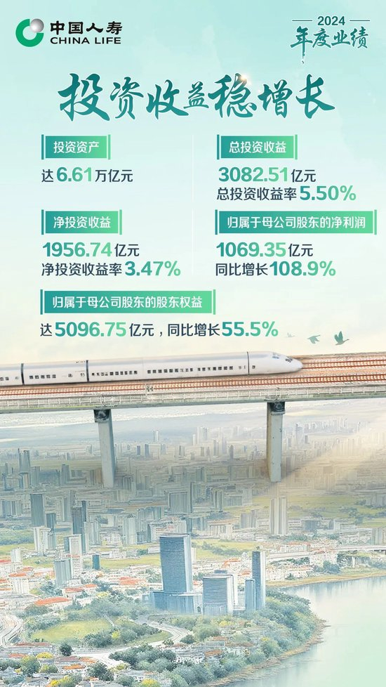截至2024年12月31日,中国人寿寿险公司投资资产达66110.71亿元。2024年,公司实现净投资收益1956.74亿元,净投资收益率为3.47%;实现总投资收益3082.51亿元,同口径同比大幅增长150.4%,总投资收益率为5.50%。