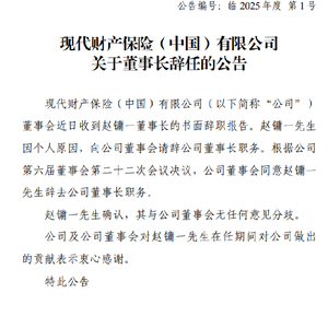 现代财险:赵镛一因个人原因辞去董事长职务
