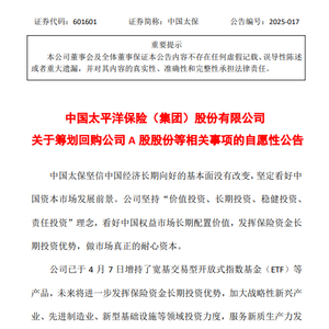 4月8日金融一线消息,中国太保发布公告称,基于对公司未来发展的信心以及对公司价值的认可,为维护公司全体股东利益,增强广大投资者信心,公司董事长傅帆先生于4月8日提议以公司自有资金回购公司部分普通股(A股)股票,回购股份用途包括但不限于维护公司价值及股东权益等法律法规允许的用途,以提升公司长期价值。